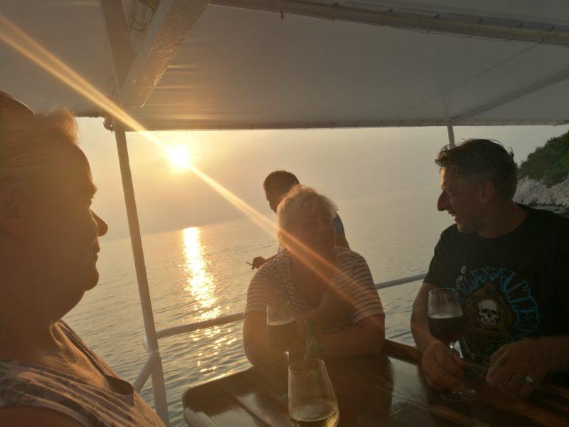 Dieses Mal machte das Boot in einer einsamen Bucht an der Insel Rab fest. Im Sonnenuntergang bekamen wir das erste Mal Besuch von Delfinen, das sollte nicht die letzte Begegnung sein. Obwohl das Bild mit Delfinen im Sonnenuntergang schon etwas kitschig wirkte, genossen alle Aquanauten das Spektakel. Auch die Tauchgänge hier erfüllten die Erwartungen. An diesem Tauchplatz konnten wir große Fischschwärme bewundern und auch ein Knurrhahn zeigte sich uns in voller Pracht.