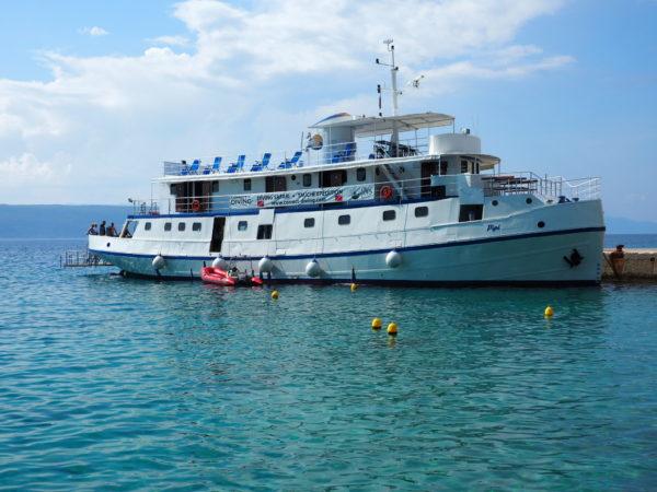 Das war der erste begeisterte Eindruck, als wir das Safariboot im Hafen sahen. Auf uns wartete die 33 Meter lange Mali Pipi (Adria Explorer), um uns mit auf eine Safari Tour durch die Kravaner Bucht mit zu nehmen.Direkt nach dem Einchecken und einen Rundgang über das Boot wurde abgelegt, um uns an den ersten Tauchplatz zu bringen.