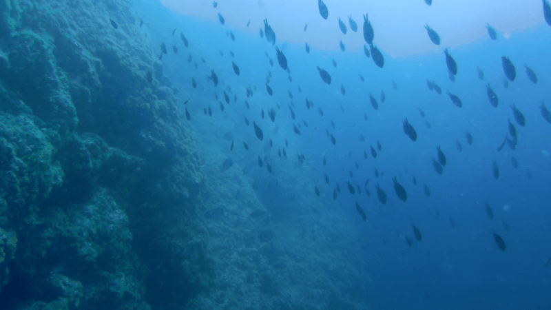 Am nächsten Tag erkundeten wir die Steilwände des Tauchplatzes. Dieses Mal wurden wir überrascht. Es ist wohl eines der schönsten Riffe der Kravaner Bucht. Große Fischschwärme, eine große Vielfallt von Nacktschnecken, Meeresspinnen und große lila Gorgonien machten den Tauchplatz zu meinem persönlichen Highlight der Tour und wir freuten uns, dass uns der Tauchguide zu einem frühen Tauchgang überredet hatte. So war es uns möglich drei Tagtauchgänge an diesem Riff zu machen. Jedes Mal waren wir aufs Neue begeistert vom Tauchplatz.