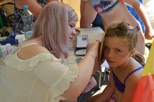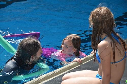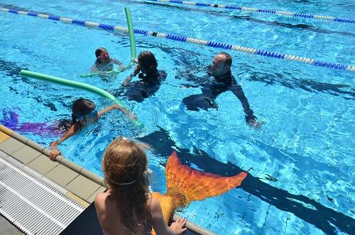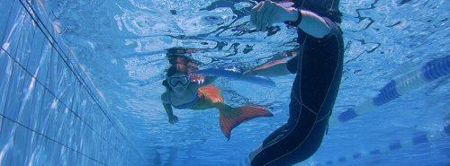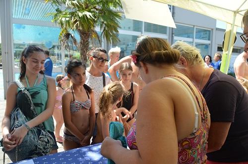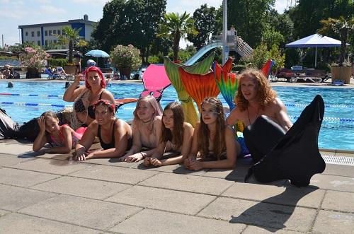 Mit Hilfe der Kostüme und passender Schminke verwandelten sich die wartenden Kinder und auch nicht wenige Eltern schnell in waschechte Meerjungfrauen und Meermänner. Obwohl Wartezeiten durch den riesigen Ansturm entstanden war die Stimmung super! Im Wasser warteten unsere Helfer, um mit den frischgebackenen Meereswesen in einer 1 zu 1 Situation den richtigen Beinschlag und die Körperhaltung beim Gleiten durchs Wasser zu üben.